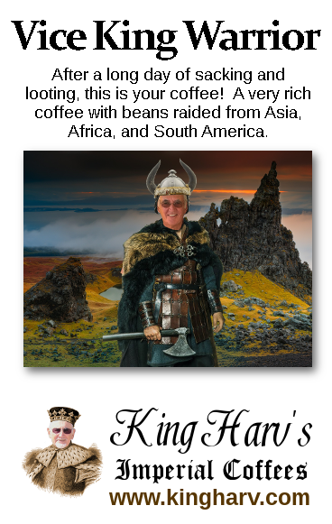 After a long day of sacking and looting, this is your coffee! A very rich coffee with beans raided from Asia, Africa, and South America. The Vice King is King Harv's Brother!